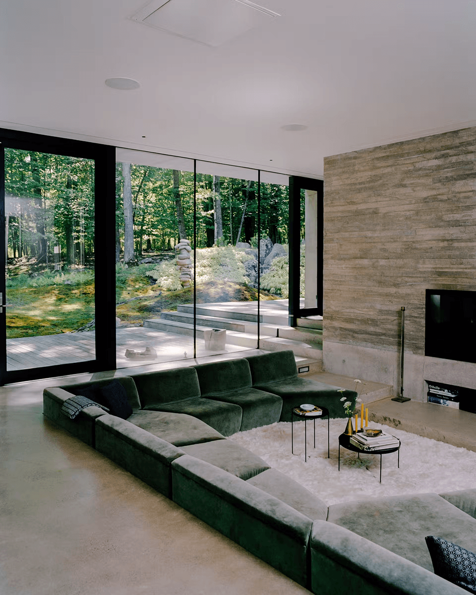 One excellent example of a modern conversation pit is that of the Levenbetts studio, where designers David Leven and Stell Betts created a sunken room in an upstate New York home. What’s quite interesting is how the pit is designed. The floor level rises and lowers based on the site’s topography. The living space in this guesthouse is already a stepped-down space. The addition of a few more steps lowers the guest into a U-shaped couch area. A more modern sectional-style sofa lines the space.