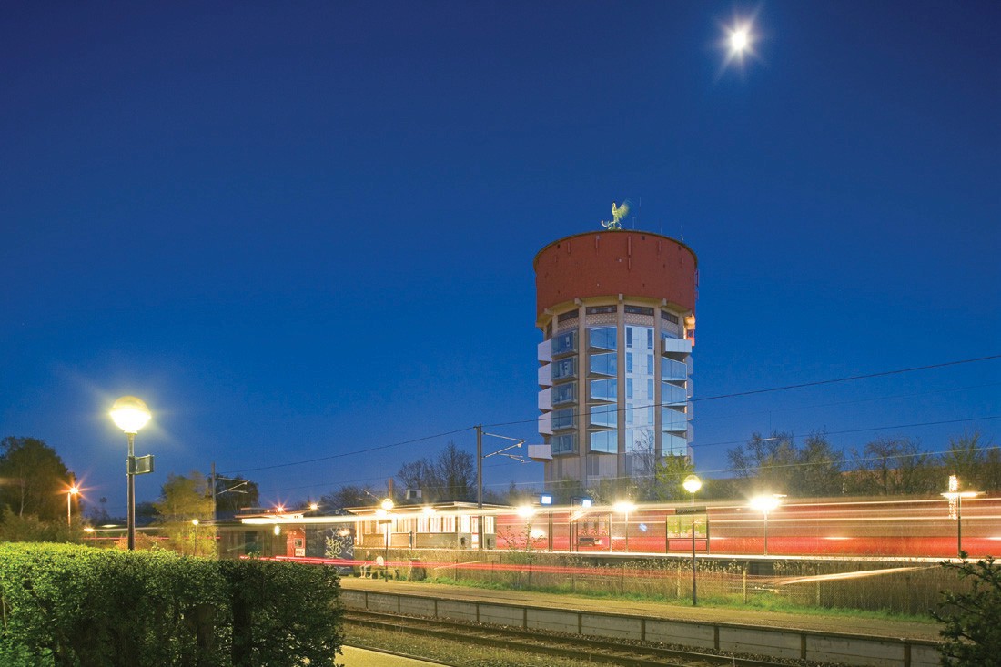 Stand at a distance. It still looks very much like a water tower. As you approach, you'll notice differences. The Jaegersborg Water Towner now features student housing along the upper floors. Each unit also has an added crystalline structure on the front. This provides added daylight and enhances the surrounding view.