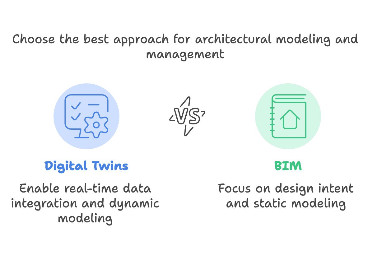 Both work together. We can use BIM to design and build a space. Then, digital twins can be used to maintain that structure over time. Pretty beneficial when used together.