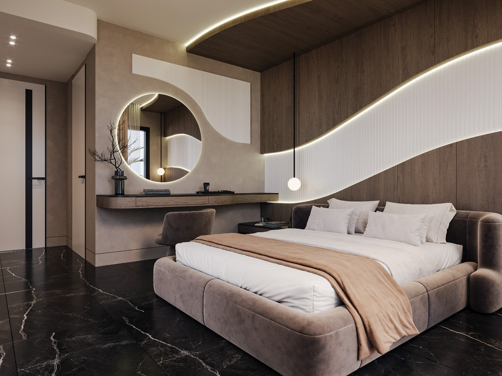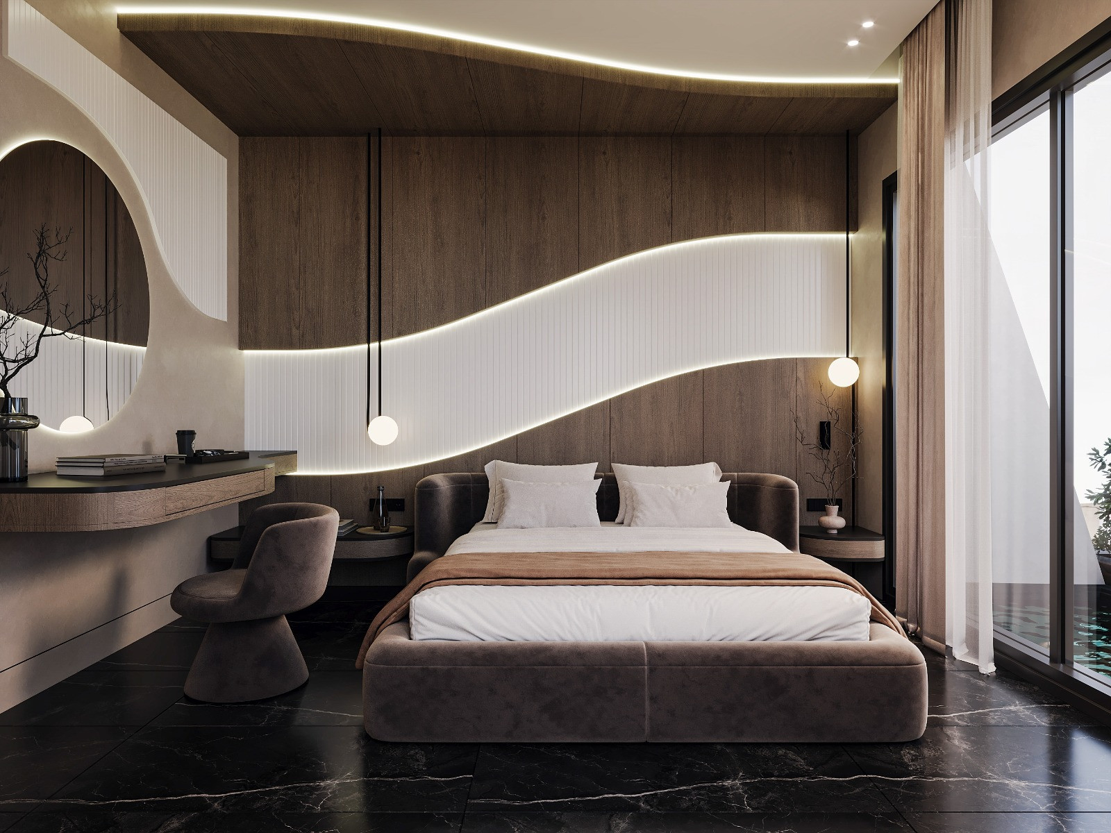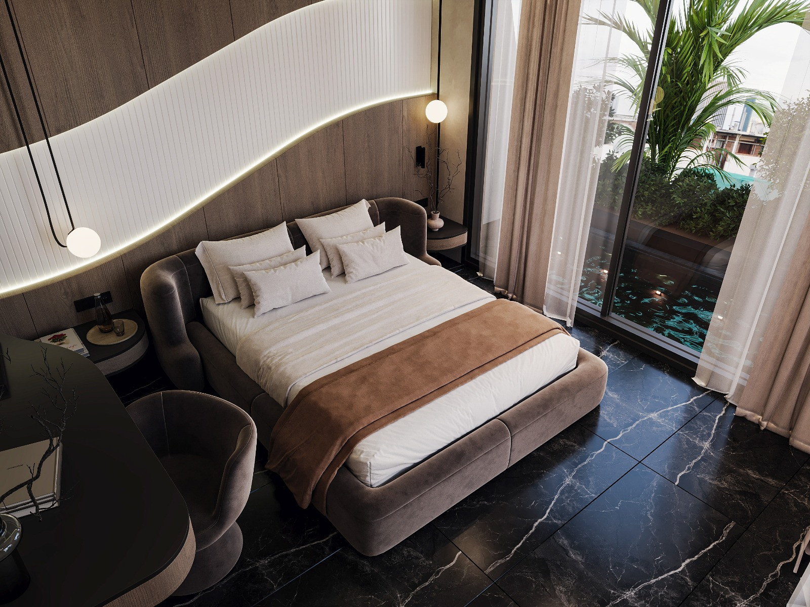 This hotel bedroom was designed to create a calm and immersive atmosphere through soft curves and warm natural materials. The sculptural headboard wall, highlighted by integrated linear lighting, forms the main visual identity of the space. Dark marble flooring contrasts with the wooden surfaces, adding depth and a refined sense of luxury. Large glass openings strengthen the connection with nature, allowing natural light to complement the warm interior palette.