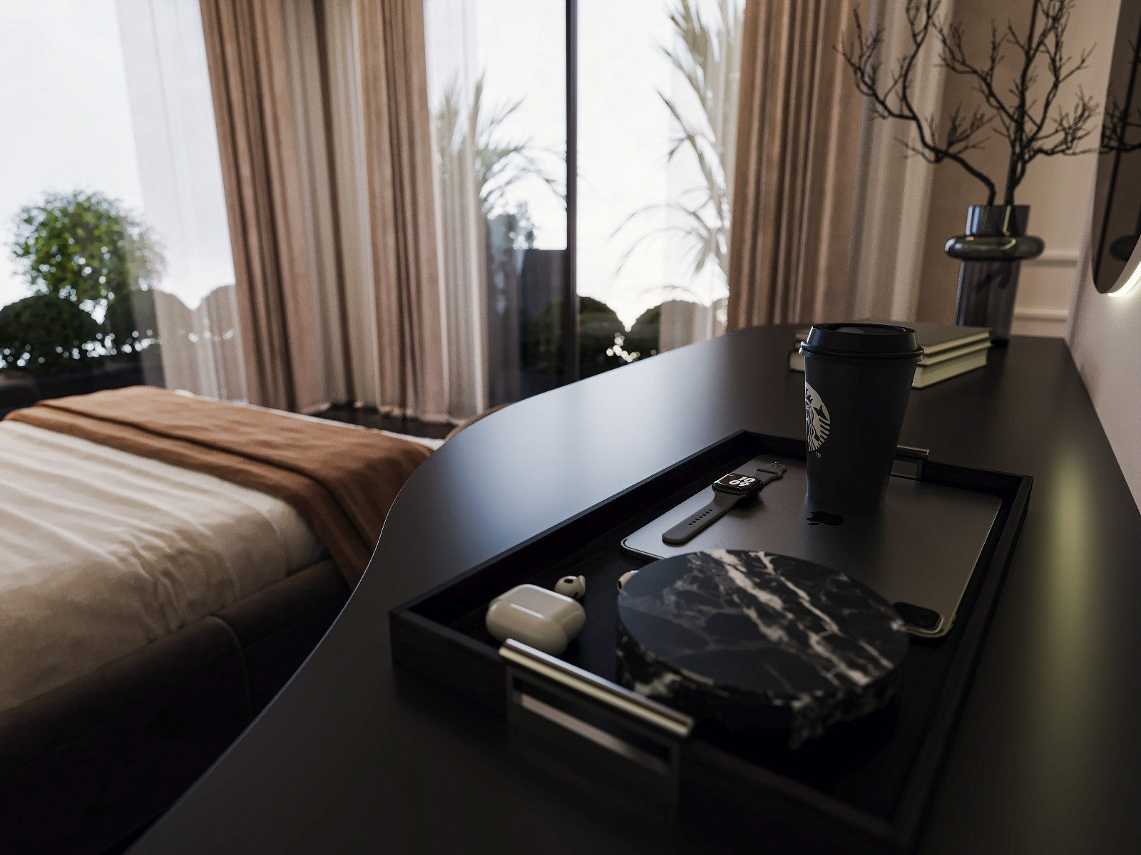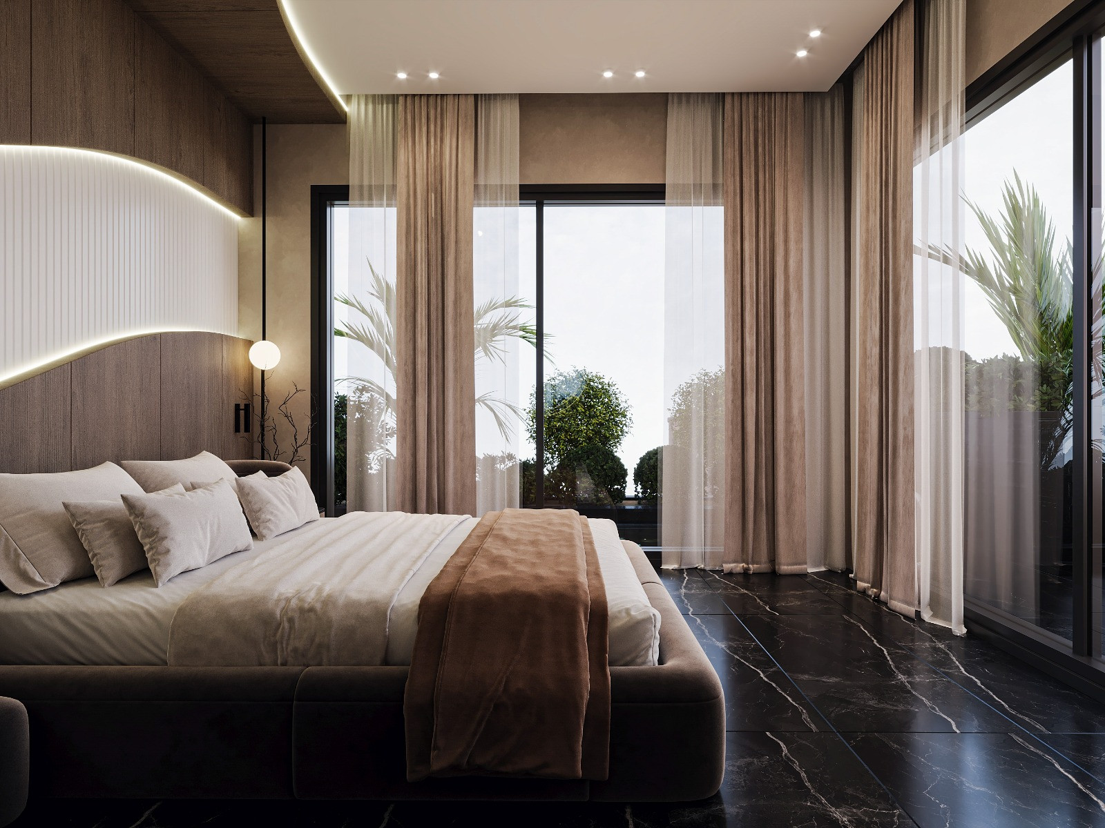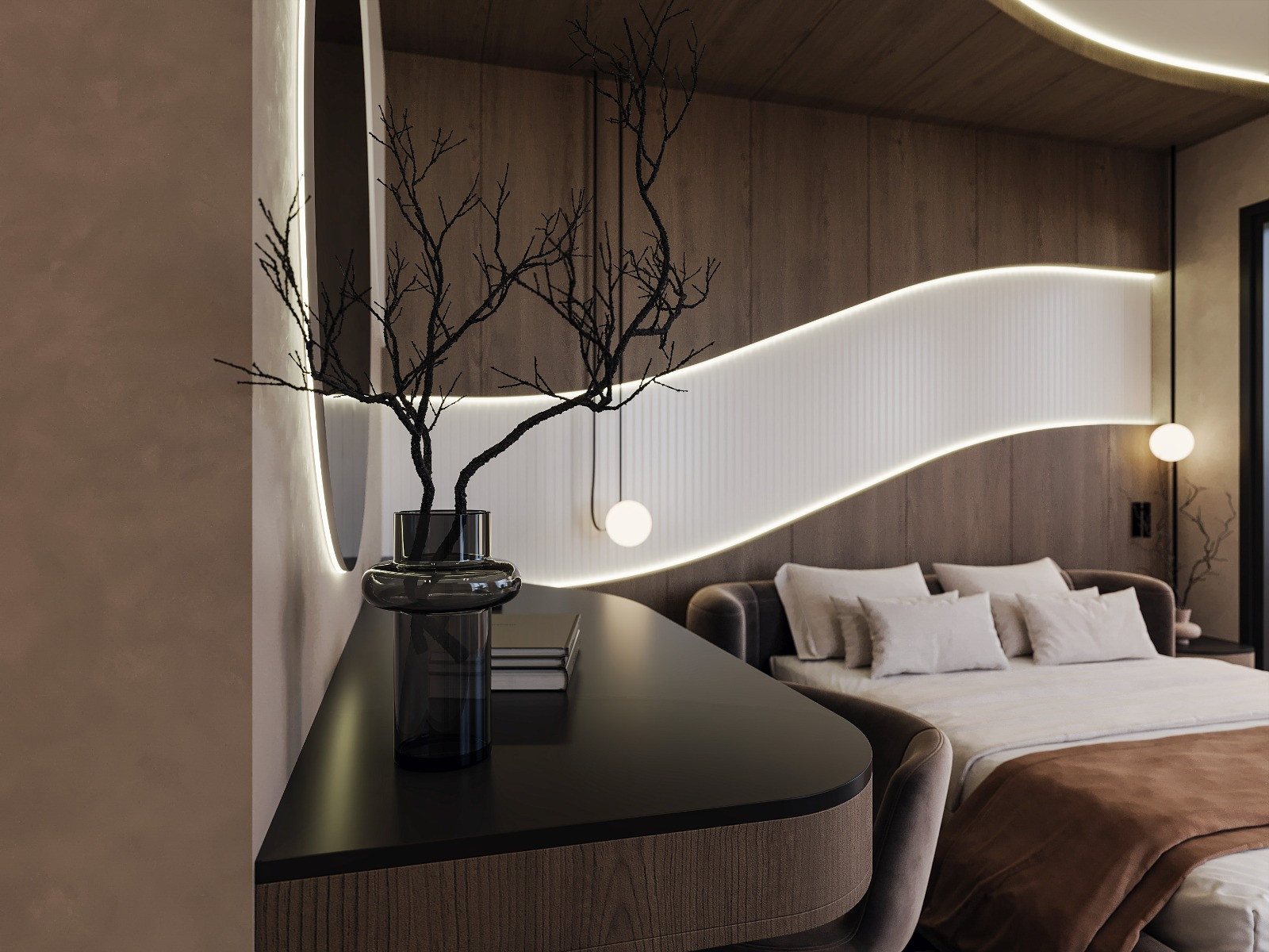 This hotel bedroom was designed to create a calm and immersive atmosphere through soft curves and warm natural materials. The sculptural headboard wall, highlighted by integrated linear lighting, forms the main visual identity of the space. Dark marble flooring contrasts with the wooden surfaces, adding depth and a refined sense of luxury. Large glass openings strengthen the connection with nature, allowing natural light to complement the warm interior palette.